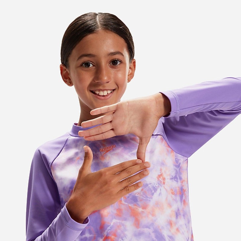 Irradia vibraciones veraniegas con este elegante top de baño de manga larga en colores pastel en un hermoso color lila con mangas estampadas con teñido anudado en contraste. La cómoda camiseta sin cordones incluye protección solar UPF40 dentro y fuera del agua. Llevando a los jóvenes nadadores de la playa a la piscina, nuestro tejido ECO EnduraBrite ofrece un rendimiento de color excelente, para que pueda disfrutar de los colores soleados durante más tiempo. Al proporcionar una mayor resistencia al cloro que las telas de trajes de baño estándar, la camiseta sin mangas se ajusta como nueva por más tiempo con CREORA® HighClo™ y está hecha 100 % de desechos posconsumo, como botellas de plástico.